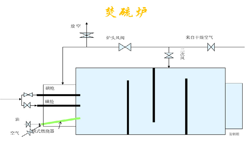 The sulfur burner is of high efficiency horizontal or vertical type with steel cylinder lined with firebrick and insulation brick. In order to make full contact between sulfur and air, three baffle walls are set up in the furnace body. At the same time, in order to avoid insufficient sulfur combustion and the production of elevated sulfur, a secondary air is set up to supplement the air volume and adjust the furnace temperature, so as to promote complete combustion and avoid the production of elevated sulfur. Due to the large load of the equipment, two sulfur nozzles are set up and mechanical atomization is adopted (that is, sulfur atomization by liquid sulfur pressure). In addition to ensuring the required amount of sulfonate, the nozzle design must also be able to form particles that are easy to atomize, the spray Angle is large, the atomization stroke is short and the dispersion is uniform. In order to prevent the spray gun from being damaged by high temperature in the furnace and caused by heat, the sulfonate viscosity rises and causes blockage, the spray gun has a steam jacket.