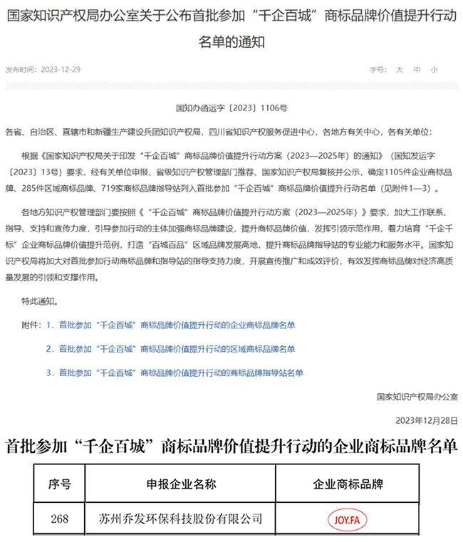 国家知識産権局はこのほど、「千企百城」商標ブランド価値向上行動に最初に参加したリストを発表した。申告、推薦及び再審査を経て、最終的に1105件の企業商標ブランド、285件の地域商標ブランド及び719社の商標ブランド指導ステーションを選定した。蘇州市は計36社が選ばれ、選ばれた総数は全省トップであり、蘇州喬発環保科技股份有限公司(以下、「喬発科技」という)は第1陣の企業商標ブランドリストに選ばれた。
